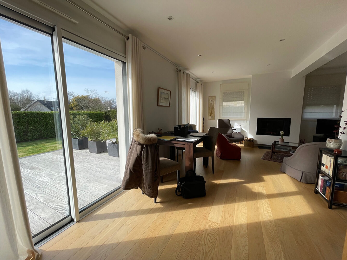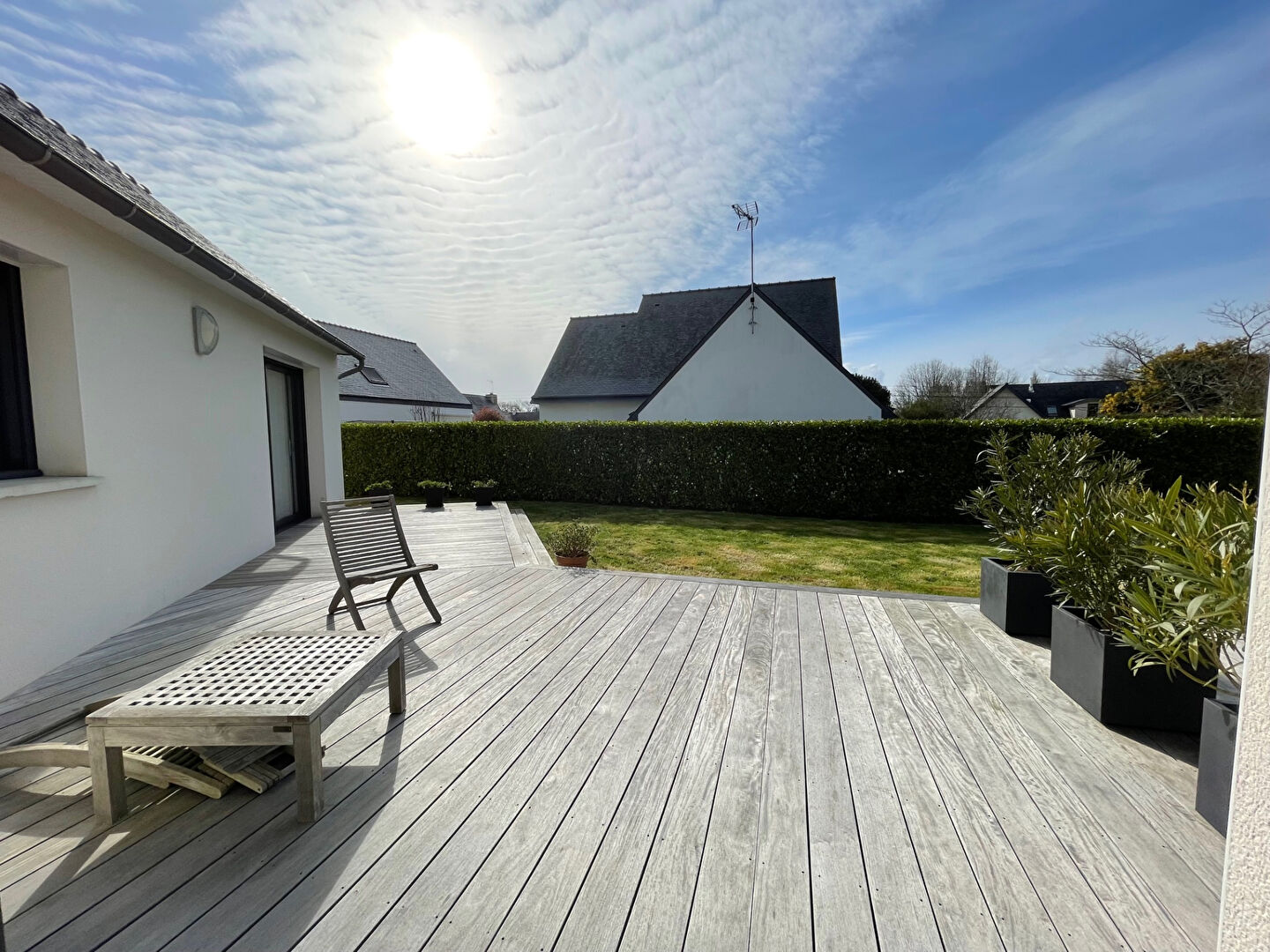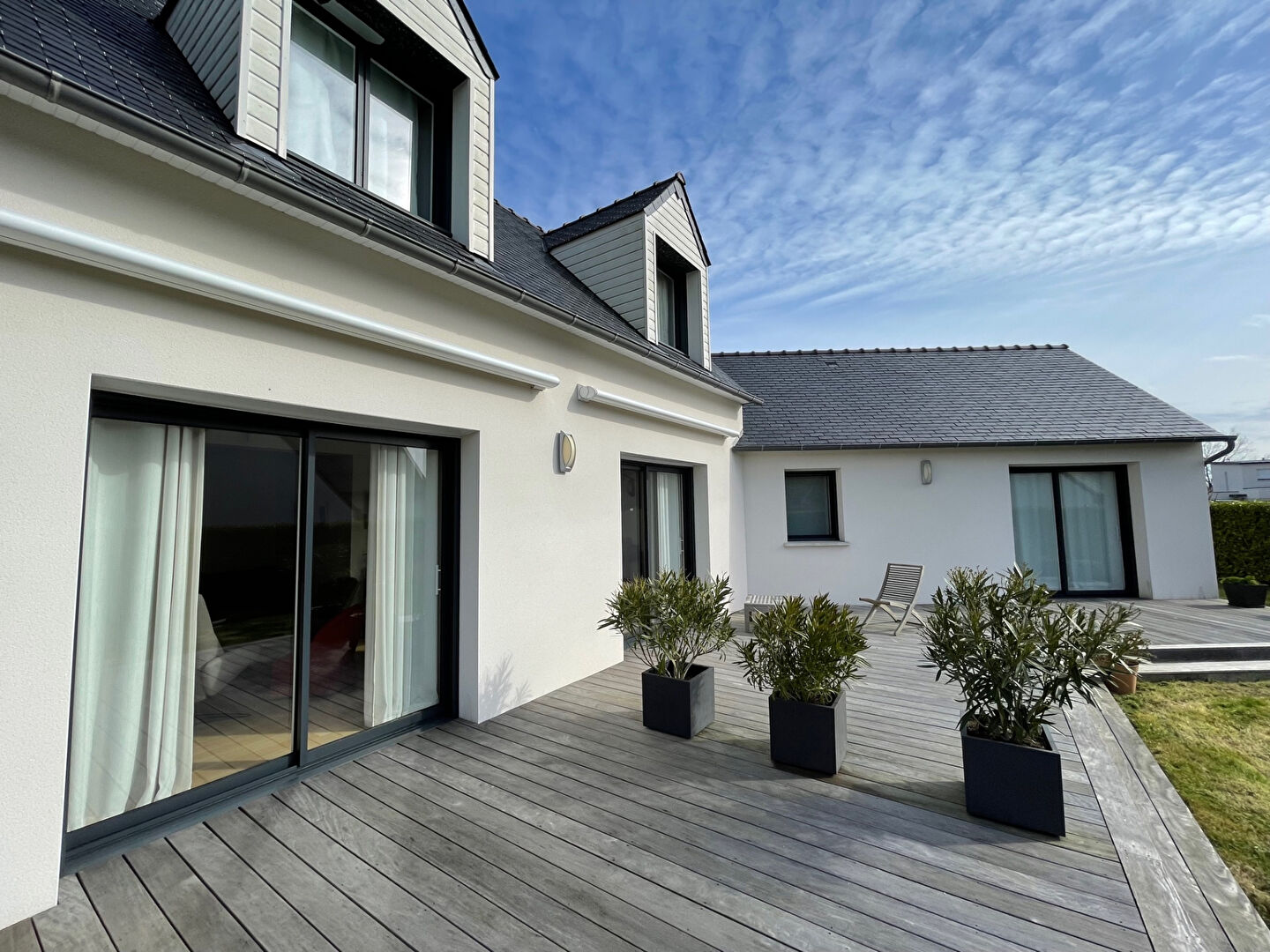 Fouesnant BEG-MEIL, belle contemporaine de 2016 non mitoyenne construite sur un terrain de 441 m² au calme. Elle est composée d’une belle pièce de vie avec cheminée insert s’ouvrant sur une terrasse exposée SUD, cuisine aménagée équipée haut de gamme, buanderie, suite parentale en rdc avec dressing et salle d’eau, wc et chambre s’ouvrant sur la terrasse. A l’étage une chambre avec salle d’eau et wc ainsi qu’un coin nuit ou bureau. Rare sur le marché ! (5.71 % honoraires TTC à la charge de l’acquéreur.)