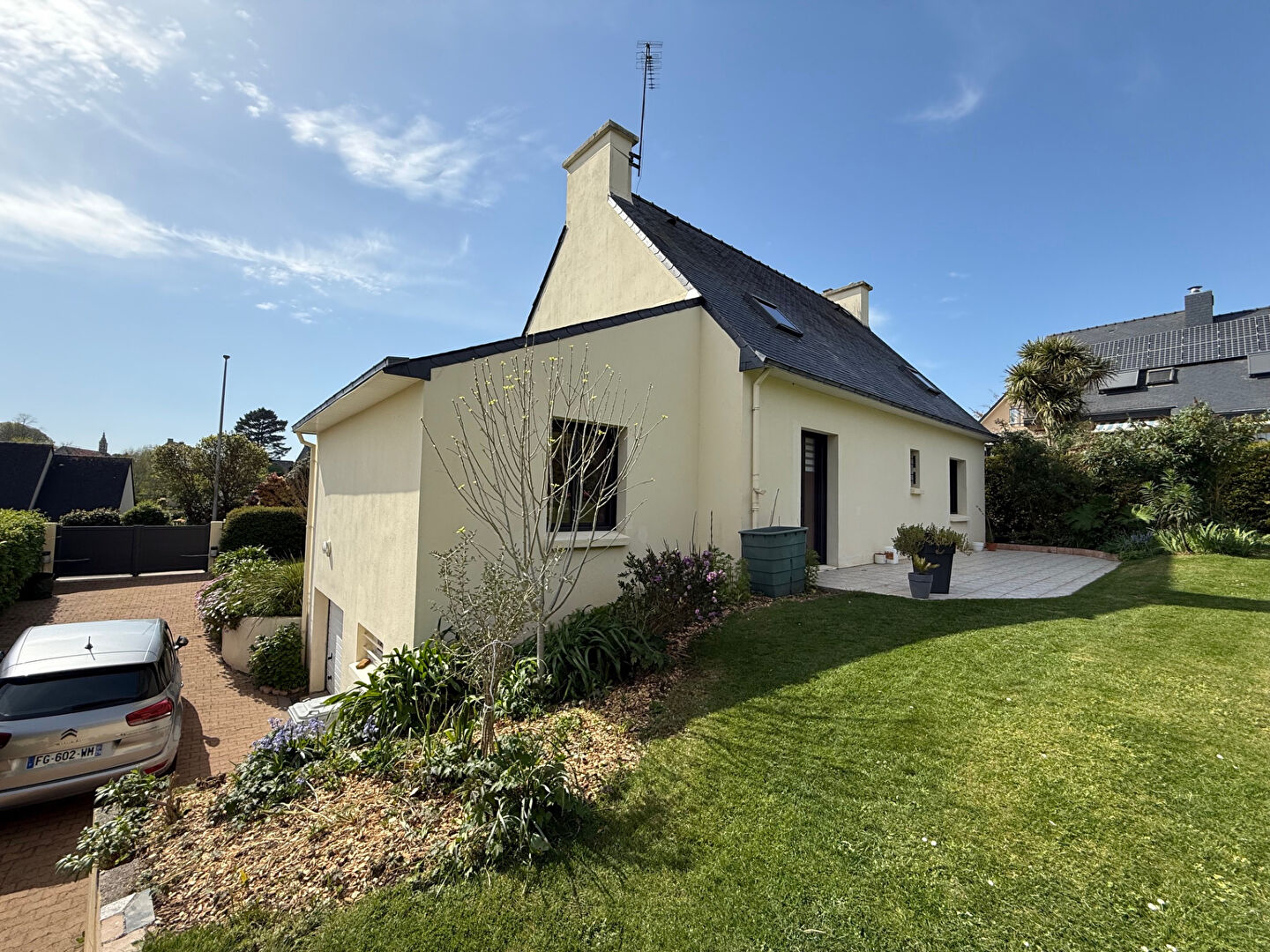 QUIMPER SUD Ergué-Armel, Quartier calme en réseau bus et à proximité des commerces, écoles… Maison familiale non mitoyenne construite sur sous-sol complet et terrain de 860 m² Elle est composée au rez-de-chaussée d’une entrée, une très belle pièce de vie d’environ 50 m² séparée par une cheminée insert à double foyer, cuisine aménagée, bureau ou chambre d’appoint, salle d’eau avec wc.